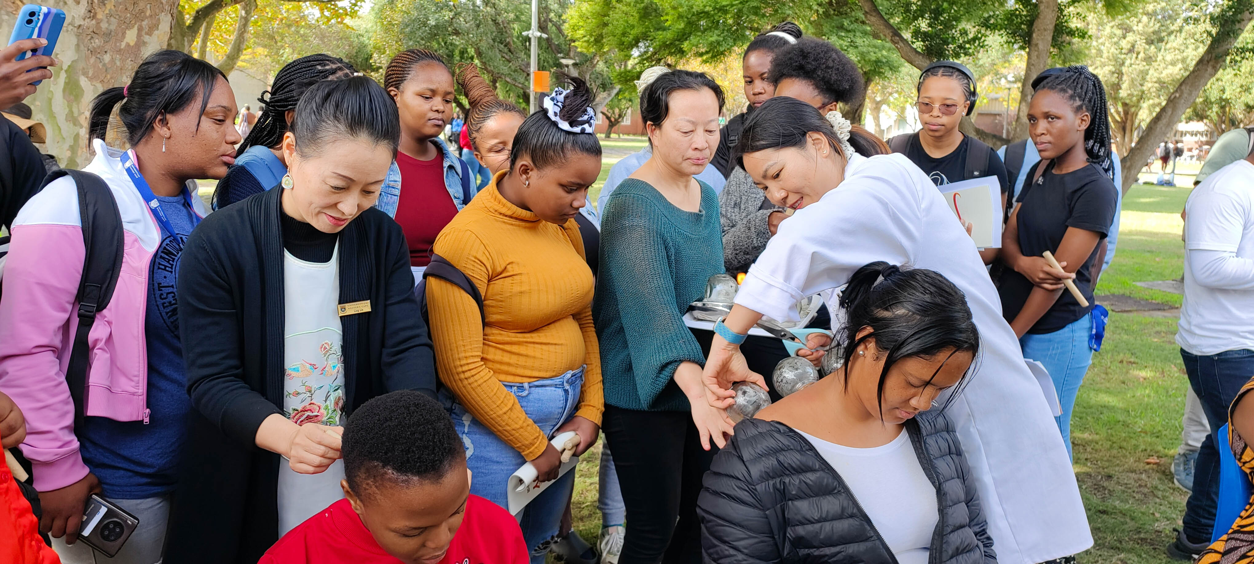 西开普大学中医孔子学院公派中医教师杨杭现场演示了拔罐疗法,并根据现场同学老师的不同病症进行简要的诊断。现场参加活动的老师同学们争先恐后排队体验。针灸、艾灸等项目体验也受到老师同学们的热烈追捧,大家纷纷上前一试究竟。杨老师为老师和同学们讲解道:在中医里拔罐疗法是指将加热杯放在皮肤上产生真空状态,从而促进血液流动使身体放松的一种医疗技术;艾灸则是在皮肤上或皮肤附近通过燃烧干艾草来刺激穴位,从而达到治疗效果;针灸是使用细针来刺激身体特定穴位从而治疗疾病的医术。