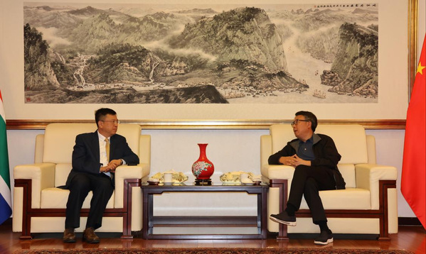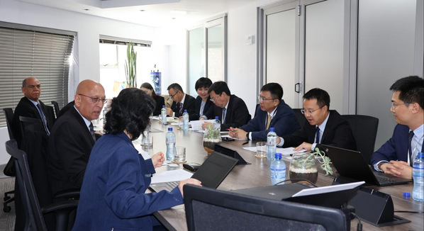 邱利民一行访问中国驻南非大使馆并与吴鹏大使会谈。图片来源 国际处