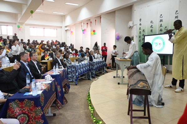 张庆伟一行听取了孔院工作汇报并欣赏了师生精彩演出。图片来源 雅温得第二大学孔子学院