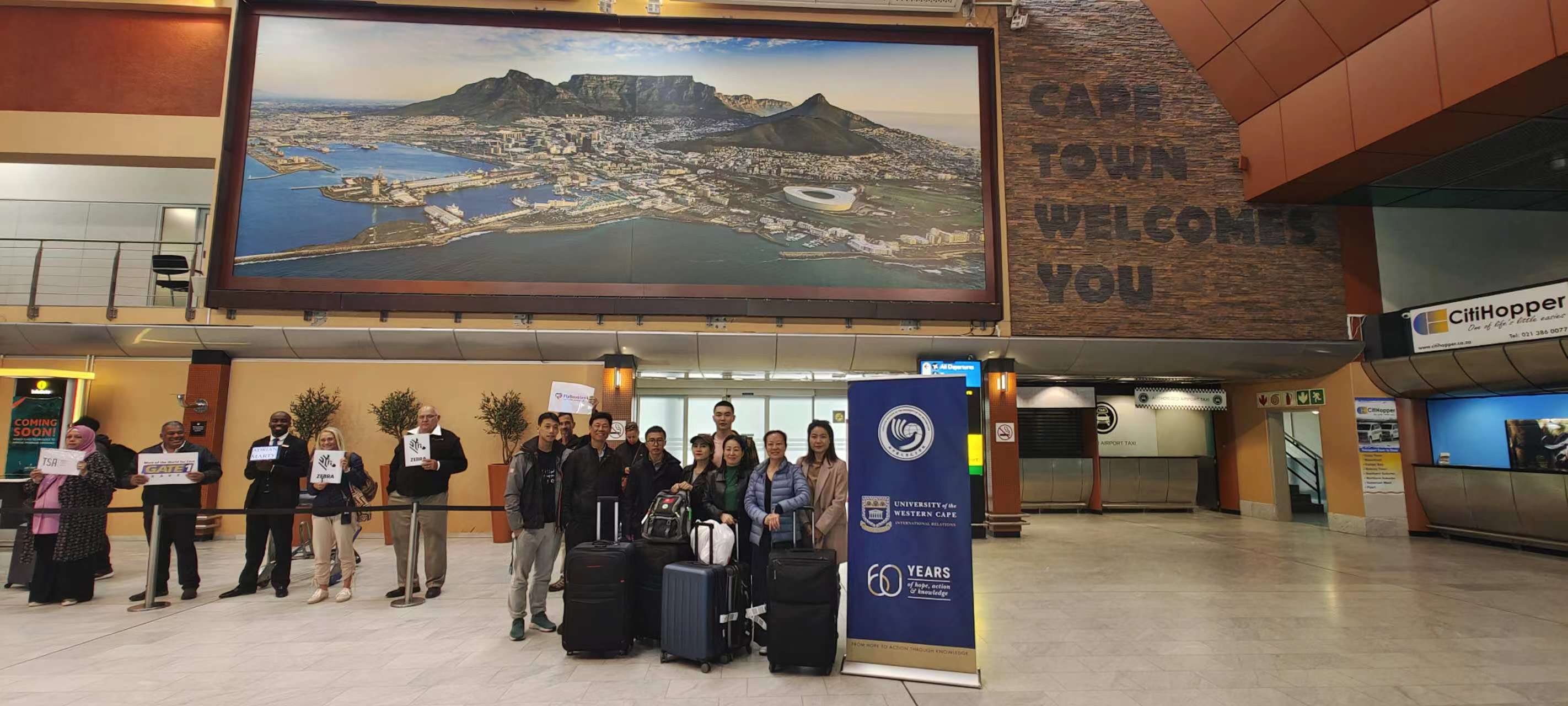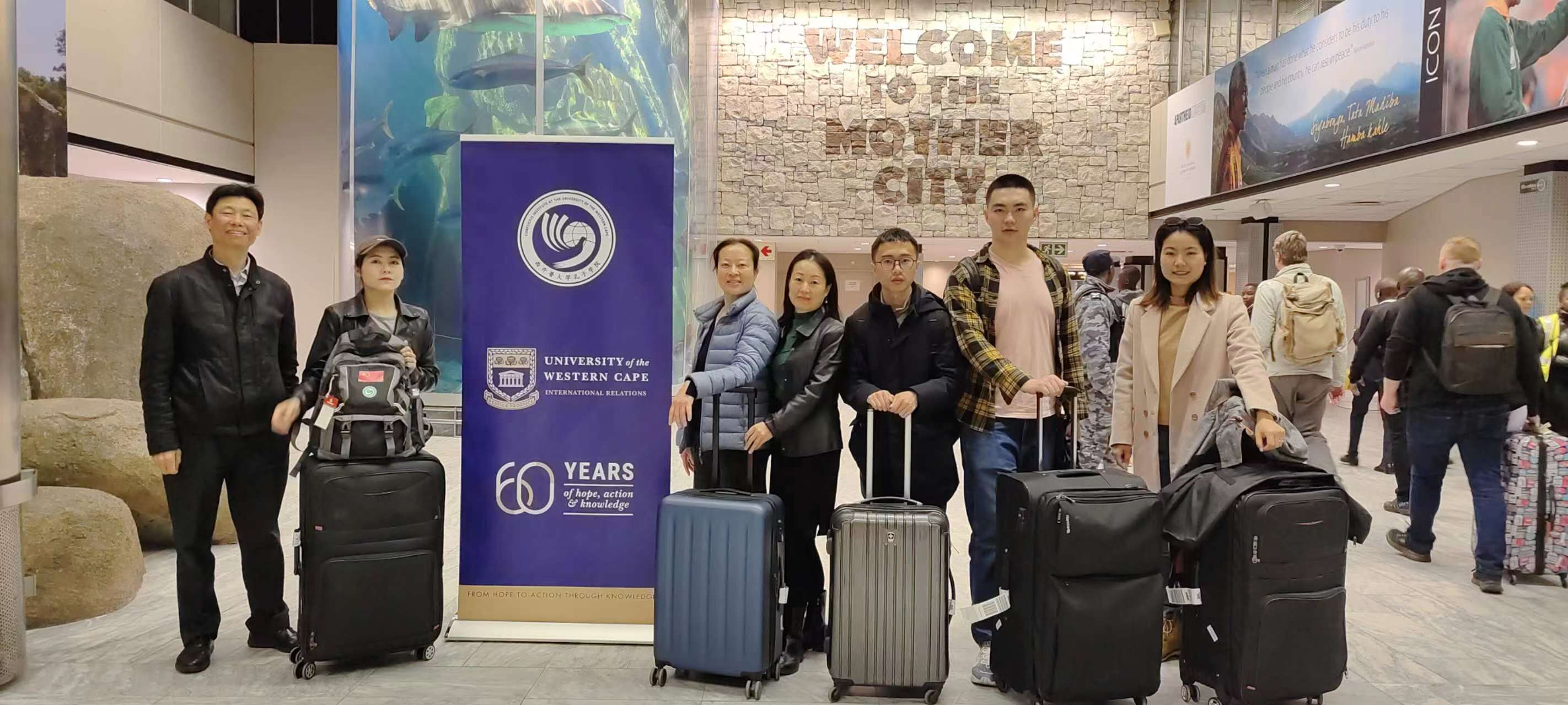 近日,南非西开普大学中医孔子学院三名国际中文教育志愿者教师(罗丽、谌轮天、霍明威)抵达开普敦国际机场,中方院长曾立人、外方院长武长虹一行前往机场迎接。